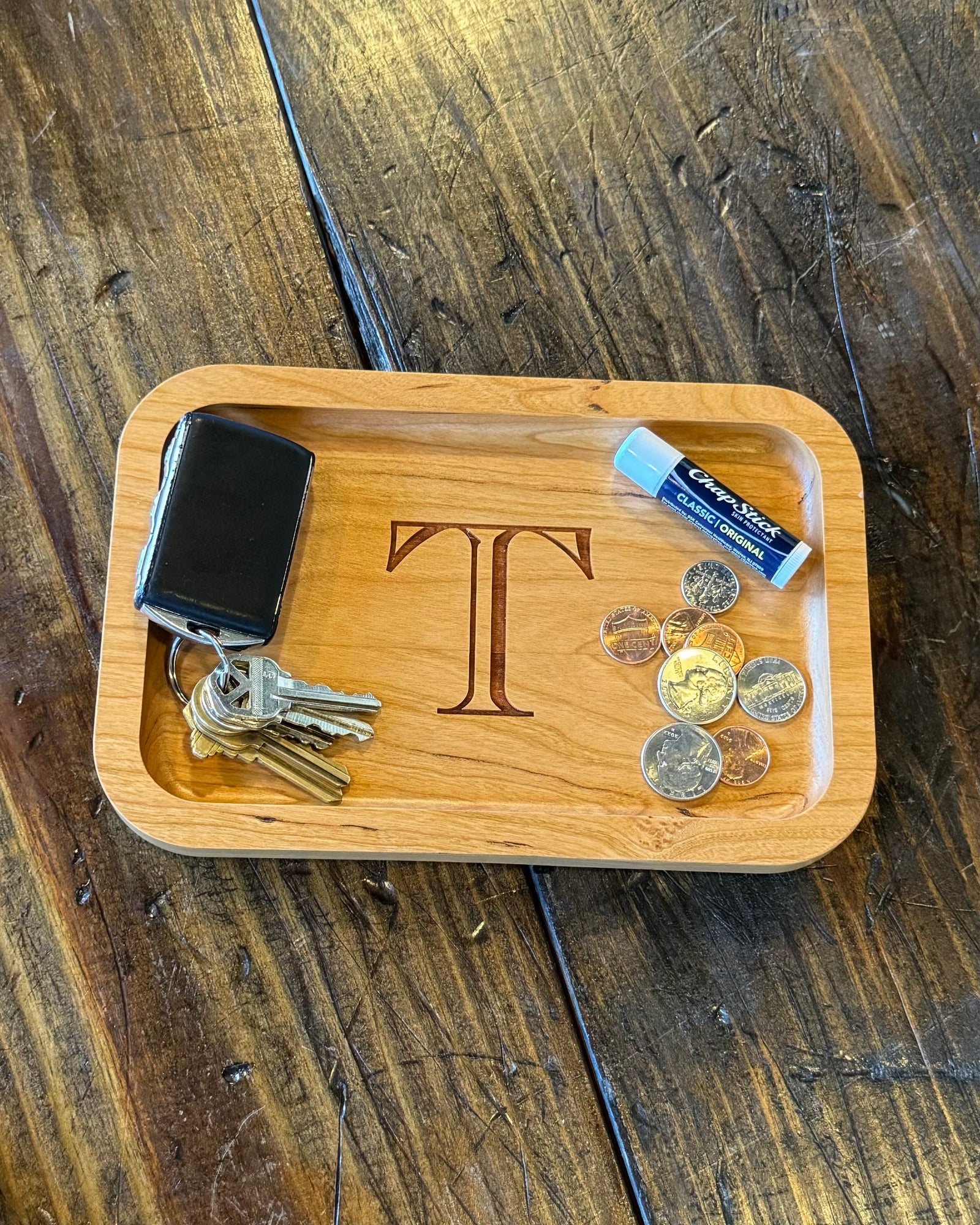 Cherry Wood Tray - Personalized Letter Engraved Wooden Valet Catch-All Dish