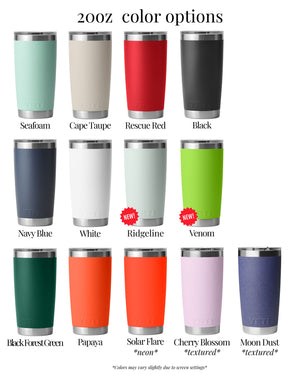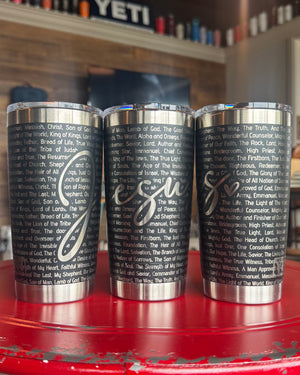 The YETI 20oz Rambler engraved travel mug is a premium insulated drinkware designed to keep your beverages hot or cold for hours while showcasing your faith with style. Crafted from durable stainless steel, this engraved travel mug offers double-wall vacuum insulation that keeps drinks hot or cold up to 24 hours, making it the perfect personalized coffee cup for daily use or travel. Featuring a full wrap engraving with the word “Jesus” at its center, surrounded by powerful titles and words that reflect His nature, this Bible verse tumbler blends meaningful design with superior functionality.