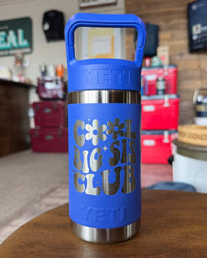The Laser Engraved Authentic Yeti 12oz Kids Bottle is a premium Yeti kids bottle designed to keep your child's drinks ice cold for hours. This insulated kids bottle features a double walled kids cup construction that maintains temperature and prevents condensation, making it perfect for everyday use. Crafted from durable stainless steel, this 12oz stainless bottle offers a spill resistant straw cap to minimize messes and a leak proof design ideal for active children. Personalized with a cool big sis club engraving, this children's drinkware combines style with functionality, making hydration fun and easy.